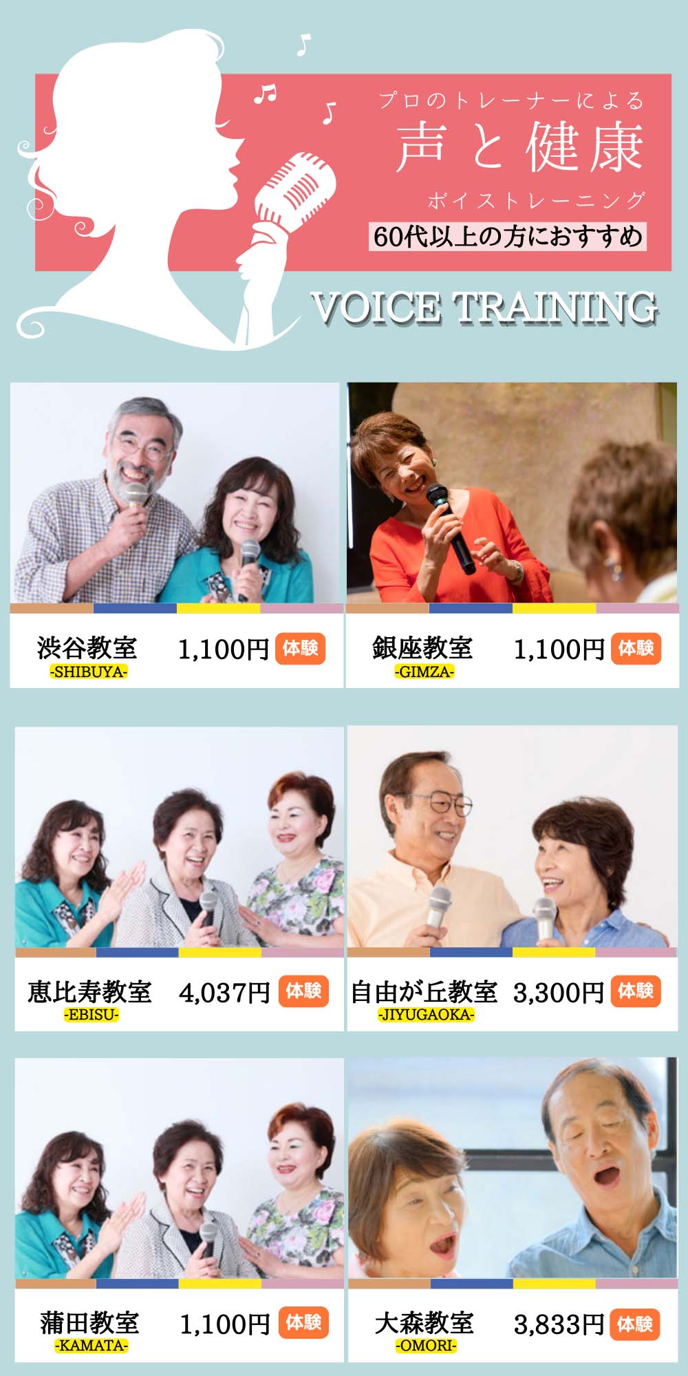 白金教室ではマンツーマンによるボイストレーニングを行っていますが、白金教室以外の6拠点(渋谷・銀座・恵比寿・自由が丘・蒲田・大森)では、シニア向けに特化した「声と健康ボイストレーイング」グループレッスンを行っております。