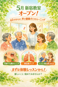 ご好評をいただいている「声と健康ボイストレーニング」教室が、より多くの方にご参加いただけるよう、5月より新宿教室を新設します。 JR新宿駅西口から徒歩約4分。通いやすい立地で、お出かけの合間にも無理なく通えます。 発声を […]